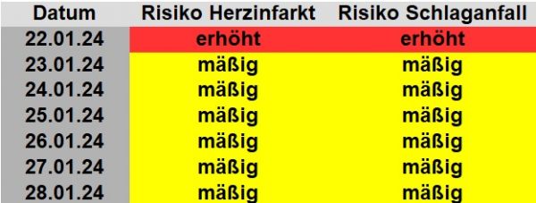 Nach anfänglich noch erhöhten Schlaganfall- und Herzinfarktrisiken sinken die Risiken ab Dienstag auf ein mäßiges Niveau.