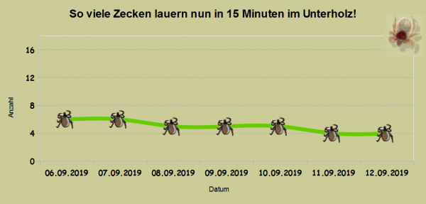 Das Tief über der Nordsee, welches unserem Land bis zu Beginn der neuen Woche immer wieder Schauer bringt, halten die Zeckenzahlen zunächst noch auf stabilem Niveau - in fünfzehn Minuten treffen wir nun im Unterholz noch auf vier bis sechs blutdurstige Exemplare.
