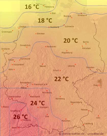 Am Abendeinbruch lockert sich auch an der Ostseeküste das Wetter wieder auf. Ansonsten ändert sich nicht viel über der Bundesrepublik. Die Temperaturen liegen bei Werten zwischen 14 Grad C und 20 Grad C in der Eifel.