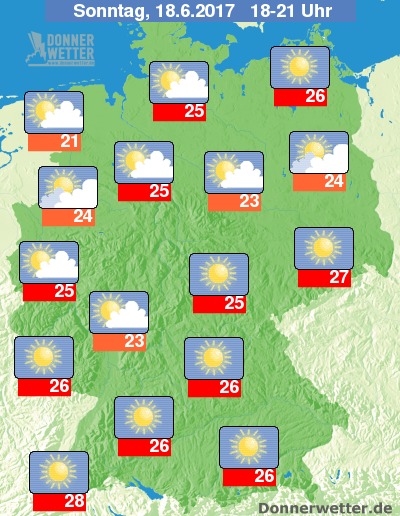 Heute Abend ist es über der Südhälfte Deutschlands weitgehend sonnig, sonst ist es heiter bis sonnig. Es bleibt landesweit trocken bei Werten von 21 Grad in Cuxhaven und bis 28 Grad in Freiburg.