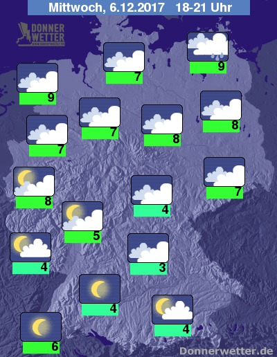 In der Nacht zum Donnerstag halten sich im Küstenumfeld und im Nordosten Deutschland meist dichte Wolken, sonst ist es im Norden und Osten teils stark, teils aufgelockert bewölkt. Im Süden und Westen ist es meist wechselnd bis aufgelockert, im Süden verbreitet nur gering bewölkt bzw. sternenklar. Es bleibt landesweit trocken bei Tiefstwerten von 8 bis -1 Grad.