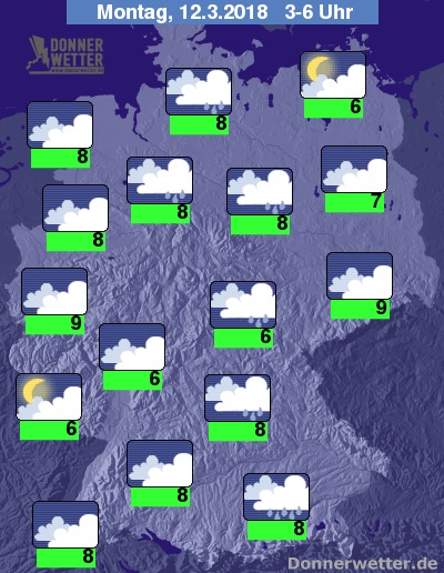In der Nacht zum Montag halten sich verbreitet dichte Wolken, die in einem breiten Streifen von Bayern, über Thüringen bis nach Schleswig-Holstein gebietsweise Regen bringen. Im übrigen Bundesgebiet bleibt es weitgehend trocken. Die Temperatur sinkt auf 9 bis 6 Grad.