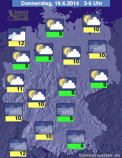 In der Nacht zum Donnerstag bleibt es weiterhin trocken und es ziehen meist nur lockere Wolken durch. Gebietsweise ist es allerdings neblig-trüb. Die Tiefstwerte erreichen 12 Grad in Freiburg und etwa 6 Grad am Bayerischen Wald.