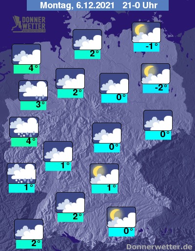 Die Temperaturen gehen bis Mitternacht auf Werte um 4 Grad an der Nordseeküste, 2 Grad an der Weser und -2 Grad in Berlin zurück.