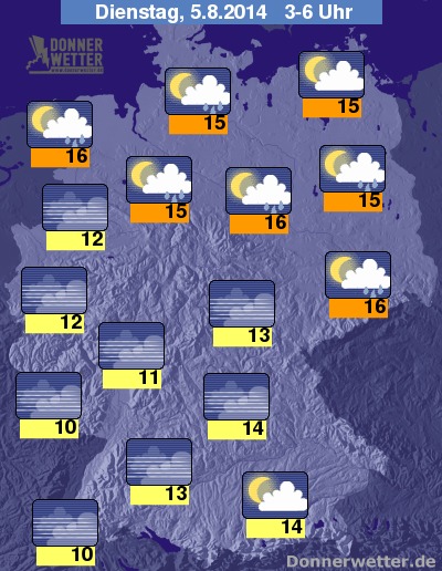 In der Nacht zum Dienstag sind vor allem im Norden und Osten noch einzelne Schauer und Gewitter möglich, sonst ist der Himmel aber auch verbreitet sternenklar, gebietsweise neblig-trüb und es bleibt trocken. Die Temperatur sinkt auf 16 Grad in Magdeburg und frischere 10 Grad am Schwarzwald.
