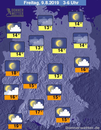 Bis zu den Frühstunden kühlt die Luft im Norden, sowie in den Mittelgebirgen auf 12 bis 16 Grad ab, im Süden und Südwesten bleibt es mit Werten zwischen 15 und 19 Grad um einiges milder.