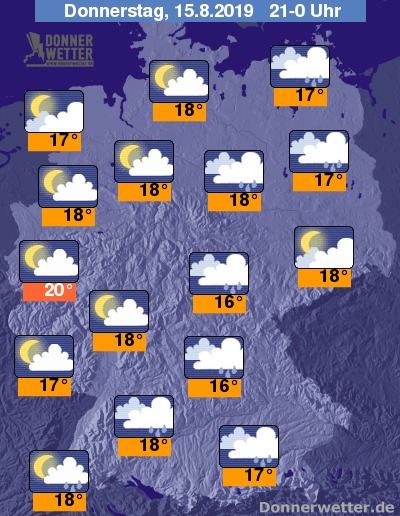 Am frühen Abend bewegen sich die Temperaturen noch zwischen 18 Grad im Ostseeumfeld und nahe 25 Grad in den Ballungsgebieten des Westens.