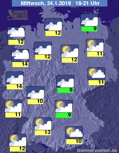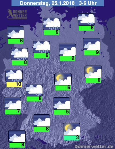 Am Donnerstag bleibt es über Bayern und Sachsen oft stark bewölkt oder trüb, jedoch trocken. Im übrigen Bundesgebiet ziehen hingegen dichte Wolken durch und es fällt immer wieder oder auch langanhaltender Regen. Die Temperatur erreicht 7 bis 12 Grad.
