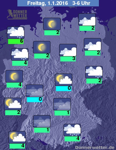 In der Nacht zum Freitag fällt im Alpenvorland und im äußeren Osten des Landes weiterhin zeitweise Regen, vor allem in höheren Lagen auch Schneeregen oder Schnee, zum Teil auch gefrierender Regen, dabei besteht erhöhte Glättegefahr! Über der übrigen Osthälfte ist der Himmel zumeist stark, teils auch aufgelockert bewölkt und dazu trocken. Weiter nach Westen ist es überwiegend sternenklar oder locker bewölkt und trocken. Im Westen und Nordwesten zieht zum Morgen hin jedoch teils etwas Regen oder Sprühregen auf, sonst bleibt es trocken. Die Temperatur sinkt auf 6 Grad an der Nordsee und bis 0 Grad in Unterfranken.
