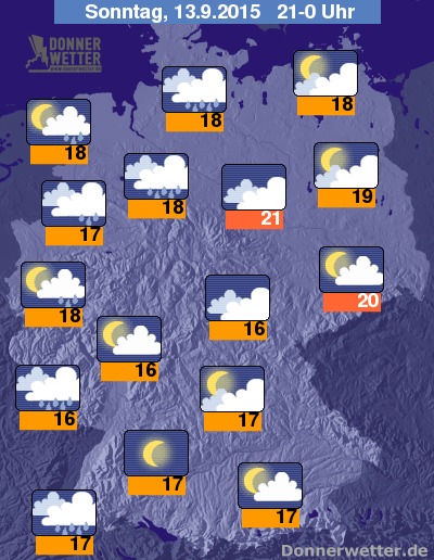 In der Nacht zum Montag ziehen von Südwesten her kompakte Regenwolken herein, die sich bis zum Morgen etwa die gesamte Südwesthälfte der Republik erfassen, dabei fällt gebietsweise langanhaltender und ergiebiger Regen. Weiter nach Norden und Osten ist es hingegen weitgehend locker bis aufgelockert, und nur hier und da auch stark bewölkt, dabei bleibt es trocken. Die Temperatur sinkt auf 17 Grad in Rostock und bis 13 Grad in der Oberpfalz.