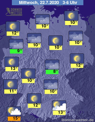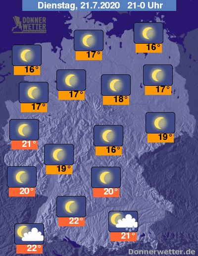 Die Temperaturen liegen am frühen Abend im Norden, sowie in den Mittelgebirgen meist nur zwischen 18 und 22 Grad, während im Süden und Westen oft noch sommerliche Werte zwischen 23 und 27 Grad gemessen werden.