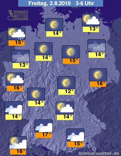 Bis zu den Frühstunden kühlt die Luft auf Werte zwischen 12 Grad in Thüringen und 17 Grad in Schwaben ab.