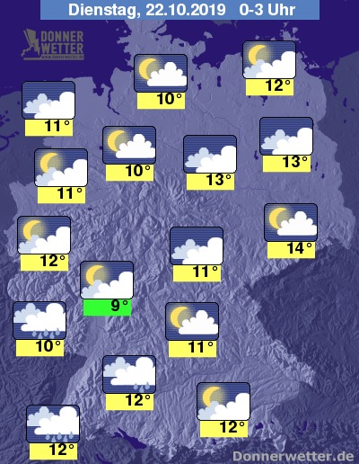 In der Nacht auf Dienstag bleibt der Himmel über der Westhälfte des Landes bedeckt oder aufgelockert bewölkt und vor allem im Südwesten setzten sich Schauer zunächst noch fort. In den übrigen Landesteilen überwiegen lockere Wolken und es bleibt trocken.