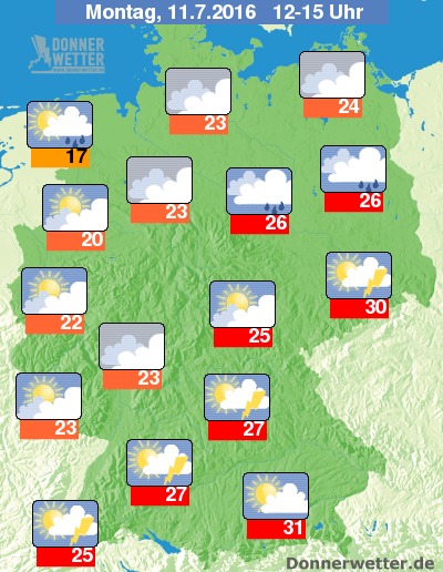 Heute Nachmittag ist es über der Nordhälfte oft stark, teils aufgelockert bewölkt und es sind Schauer, örtlich auch Gewitter möglich. Im Süden zeigen sich häufig heitere Abschnitte, dabei sind einzelne Schauer und Gewitter möglich. Im übrigen Bundesgebiet ist es verbreitet aufgelockert oder stark bewölkt und dazu weitgehend trocken. Die Temperatur liegt bei teils 17 Grad an der Nordsee und bei schwülwarmen 31 Grad in München.