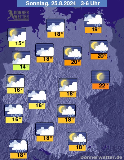 Am Abend und in der Nacht auf Sonntag verdichten sich die Wolken von Westen und Nordwesten her und es muss mit südostwärts ausgreifenden, teils kräftigen Schauern und Gewittern gerechnet werden. Nach Kaltfrontdurchzug lockern die Wolken in der Westhälfte auf, am längsten trocken bleibt es im äußersten Osten und Südosten.