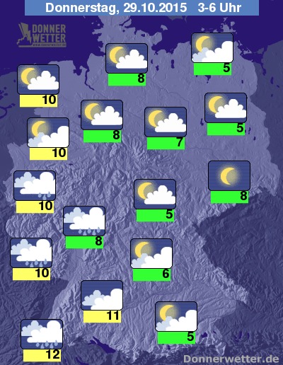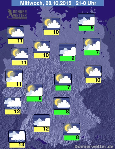 In der Nacht zum Donnerstag fällt im Südwesten und Westen unter dichten Wolken zeitweise Regen, auch über der übrigen Südwesthälfte Deutschlands ist es meist stark und nur hier und da aufgelockert bewölkt, dazu jedoch trocken. Im Norden und Osten zeigt sich der Himmel locker oder aufgelockert bewölkt und ebenfalls trocken. Die Temperatur sinkt auf 12 Grad in Freiburg und bis 5 Grad im Raum München.