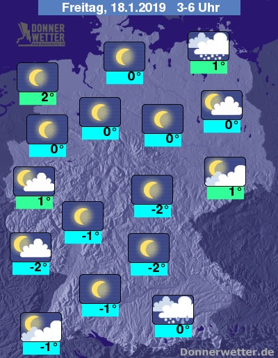 Während der zweiten Nachtälfte regnet oder schneit es dann nur noch im äußersten Nordosten, sowie am Alpenrand. Sonst zeigen sich verbreitet Mond und Sterne.