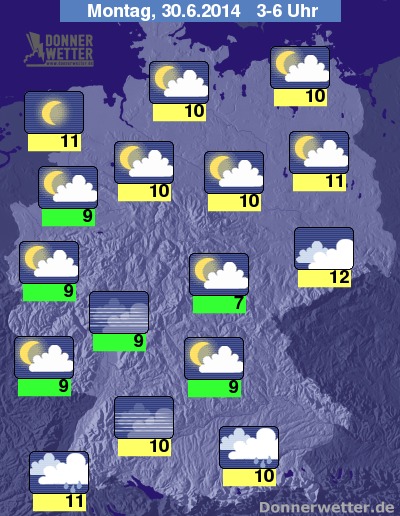 In der Nacht zum Montag lassen die Schauer meist nach und es bilden sich nur vereinzelt Schauer, nach Südosten fällt aus dichten Wolken aber zeitweise Regen, sonst lockert die Bewölkung besonders nach Westen und Nordwesten häufig auf. Die Temperatur sinkt auf 12 Grad in Dresden und 7 Grad an der Fränkischen Alb.