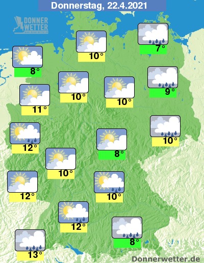 Am Donnerstag ist es häufig locker bis aufgelockert, gebietsweise aber auch stark bewölkt. Über der Nordhälfte sind vorübergehend einzelne Schauer möglich, im übrigen Bundesgebiet bleibt es von wenigen Ausnahmen abgesehen trocken. Die Temperatur erreicht 7 Grad an der Ostsee und bis 13 Grad am Oberrhein.