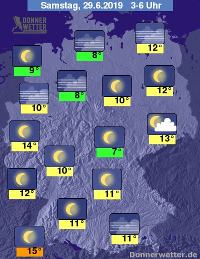 Am frühen Abend bewegen sich die Temperaturen im Norden und Nordosten zwischen 19 und 25 Grad, im Süden und Südwesten noch bei sehr warmen bis heißen 26 bis 31 Grad.