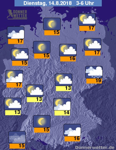 In der folgenden Nacht sind über den östlichen Landesteilen zunächst noch Schauer möglich, die im Laufe der Nacht abklingen, sonst ist der Himmel hingegen meist locker bewölkt oder sternenklar, an der Nordsee auch oft stark bewölkt, aber trocken. Die Temperatur sinkt auf 19 Grad in Dresden und bis 13 Grad im Eichsfeld.