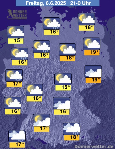Am Freitagnachmittag zeigt sich der Himmel verbreitet wechselnd bewölkt, dabei muss immer wieder mit Schauern gerechnet werden, auch lokale Gewitter sind möglich. Es weht ein frischer, in Schauern auch stürmischer Südwestwind. Im Bergland und an der See sind auch Sturmböen möglich.