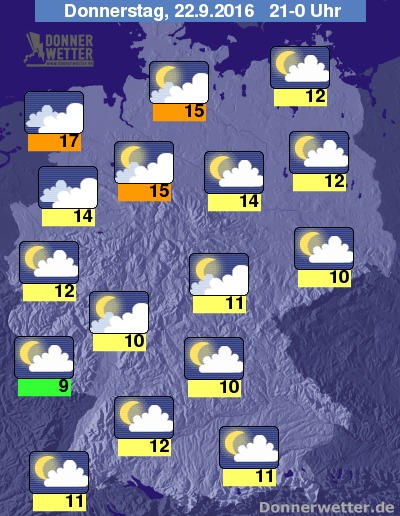 Die Temperaturen liegen in den späteren Abendstunden bei Werten um 18 Grad im Chiemgau und um 21 Grad C entlang der Weser und sinken in der ersten Nachthälfte auf 17 Grad C in Ostfriesland und um 9 Grad C im Saarland.
