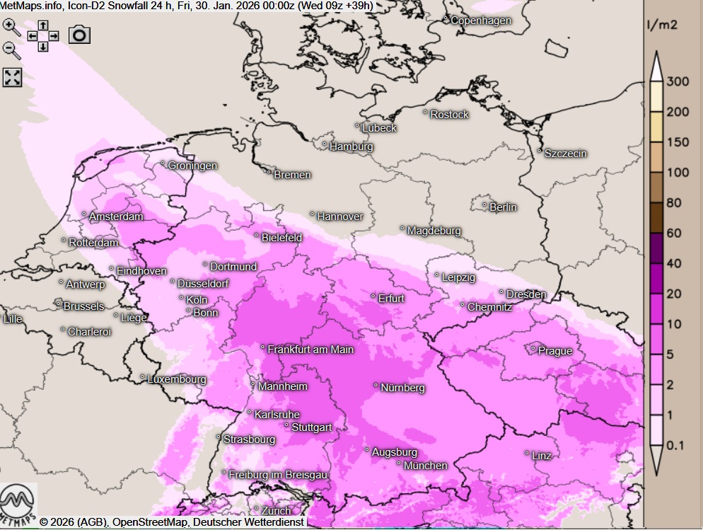 Am Donnerstag zeigt sich der Himmel in weiten Teilen des Landes stark bewölkt bis bedeckt. Dabei fällt vor allem im Süden Schnee, im Westen und Südwesten fällt der Niederschlag in tieferen Lagen auch als Regen. Im Norden und Nordosten bleibt es am Donnerstag überwiegend niederschlagsfrei.