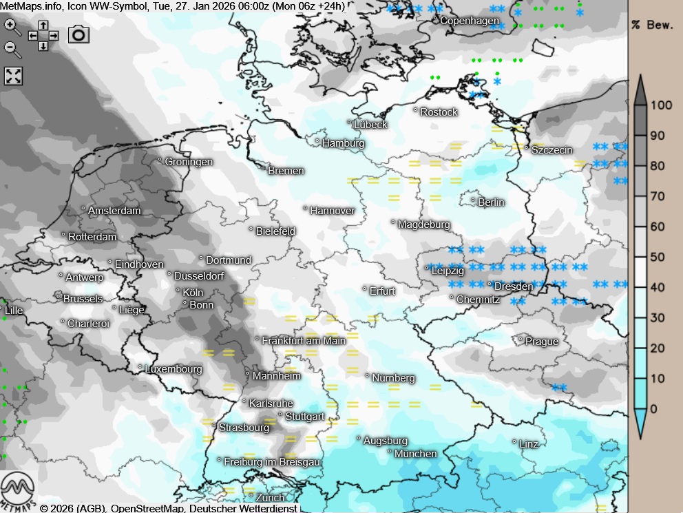 Die Wetter- und Temperaturkarte für Dienstagfrüh (06:00 Uhr) sowie die 24-Stunden-Schneemengen nach ICON: