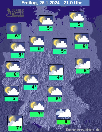 Am Abend kann es am Alpenrand anfangs noch regnen, bis Mitternacht ist es dann aber überall trocken. Dabei klart der Himmel verbreitet auf oder es ist nur gering bewölkt, im Südwesten kann sich gebietsweise Nebel bilden. Windig ist es in der Nacht noch im Osten und Nordosten Deutschlands, sonst flaut der Wind ab.