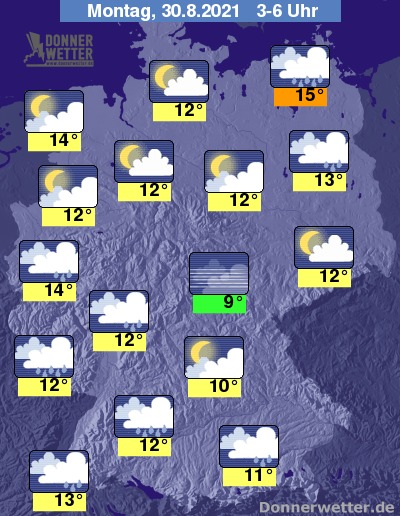 In der kommenden Nacht fällt zunächst vor allem im Süden und Westen weiterer Regen, sonst ist es oft stark, teils auch aufgelockert bewölkt und zunächst meist trocken. Im Laufe der Nacht zieht von der Ostsee her aus Nordosten zum Teil kräftiger Regen herein. In einem Streifen vom Niederrhein bis ins nördliche Bayern bleibt es aber bis zum Morgen hin weitgehend trocken. Die Temperatur sinkt auf 15 Grad in Stralsund und bis 9 Grad in Jena.