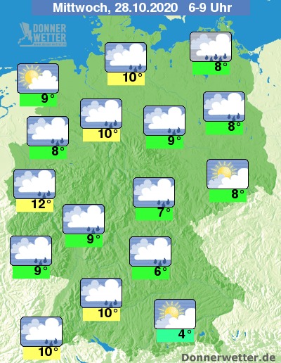 Bis zu den Frühstunden kühlt die Luft auf Werte um 9 bis 4 Grad ab, südlich der Donau kann es zu Bodenfrösten kommen. Im zweistelligen Bereich halten sich die Werte unter den Regenwolken an Niederrhein und Ems auf.