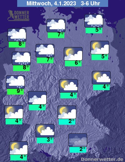 In der Nacht zum Mittwoch bleibt es über der Südosthälfte Deutschlands bei zunächst geringer, zunehmend auch stärkerer Bewölkung noch trocken. Im Nordwesten und im Verlauf auch über der übrigen Nordwesthälfte setzt bei dichten Wolken teils langanhaltender Regen ein. Die Temperatur sinkt auf 9 Grad in Köln und 2 Grad in München. Mit Ausnahme des Südens weht der Wind verbreitet stark bis stürmisch. Im Norden und Westen sind Sturmböen, an der Nordsee teils orkanartige Böen möglich.
