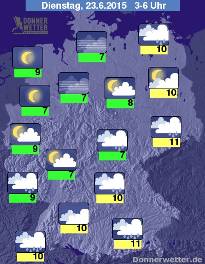 In der kommenden Nacht halten sich über der Südosthälfte Deutschlands meist dichte Wolken aus denen zeitweise Regen fällt, weiter nach Nordwesten hin lockert bzw. klart der Himmel immer weiter auf und es bleibt weitgehend trocken. Die Temperatur sinkt auf 11 Grad an der Neiße und bis etwa 7 Grad im Oldenburger Münsterland.