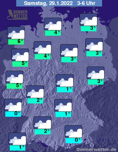 In der Nacht zum Samstag ist der Himmel über der Republik weitgehend wolkenverhangen, dazu bleibt es zum Großteil trocken. Jedoch zieht im Nachtverlauf ein kleiner Tiefausläufer mit etwas Regen über den Norden Deutschlands hinweg. Die Temperatur sinkt auf 6 Grad an der Nordsee und bis 0 Grad im Berchtesgadener Land.