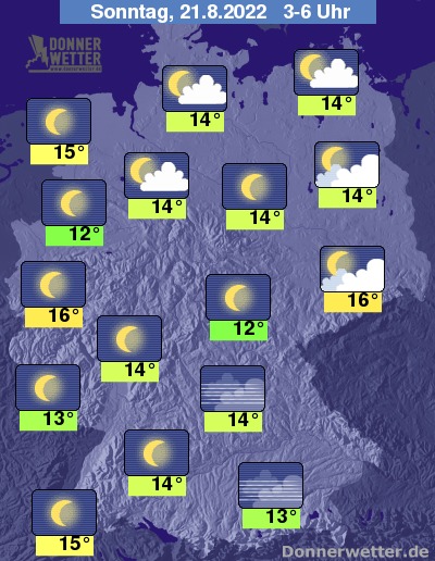 In der Nacht zum Sonntag ist es in den östlichen Landesteilen anfangs noch teils stark bewölkt, jedoch bereits weitgehend trocken. Im übrigen Land zeigt sich der Himmel schon verbreitet sternenklar und es ziehen kaum mehr Wolken durch. Es bleibt trocken bei Tiefstwerten von 16 Grad in der Lausitz und 12 Grad am Niederrhein.