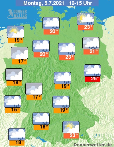 Heute Nachmittag herrscht über Deutschland verbreitet stark bewölktes Wetter. Zudem können sich wiederholt einzelne Schauer und vereinzelt auch lokale Gewitter entwickeln. Die Temperatur liegt bei 15 Grad am Pfälzer Wald und bis 25 Grad in der Lausitz.