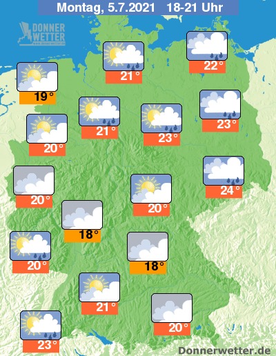 Heute Abend klingen die Schauer nach und nach immer weiter ab und die Bewölkung lockert vielerorts etwas auf. Die Temperatur liegt bei 18 Grad in Mittelfranken und bis 24 Grad in der Lausitz.