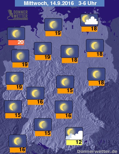 In der Nacht zum Mittwoch ist der Himmel über dem Land weitestgehend nur sternenklar. Einige, meist jedoch wenige Wolken können über Mecklenburg-Vorpommern und am Alpenrand auftauchen, dabei bleibt es trocken. Die Temperatur sinkt auf tropische 20 Grad am Dollart und bis 12 Grad im Raum München.
