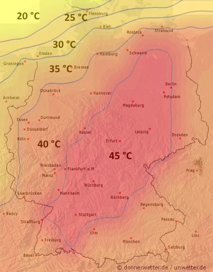 Heute Abend zeigt sich die Bundesrepublik verbreitet sonnig und dabei trocken. Nur selten ziehen auch mal lockere Wolkenfelder durch. Im Südwesten und stellenweise auch an der Nordsee besteht jedoch ein leichtes Schauer- und Gewitterrisiko. Die Temperatur liegt bei 27 Grad in München und etwa 31 Grad im Ruhrgebiet.