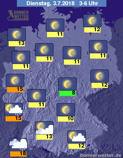In der Nacht zum Dienstag zeigt sich der Himmel überwiegend sternenklar, im Südwesten können dichtere Wolken hier und da einzelne Schauer oder sogar Gewitter bringen, sonst bleibt es aber trocken. Die Temperatur sinkt auf 18 Grad in Freiburg und bis 8 Grad im Vogtland.