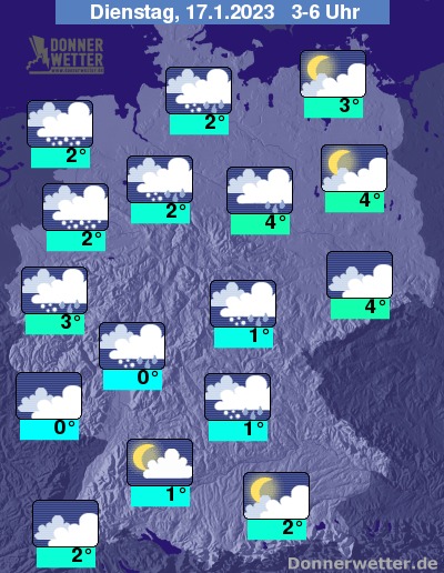 In der kommenden Nacht bleibt es lediglich im äußeren Süden, Osten und Nordosten weitgehend trocken und zum Teil auch aufgelockert bewölkt. Im großen Rest des Landes bringen dichte Wolken immer wieder Regen, Schneeregen und zunehmend auch Schnee bis in tiefste Lagen. Die Temperatur sinkt auf 4 Grad in Berlin und 0 Grad in Wiesbaden.