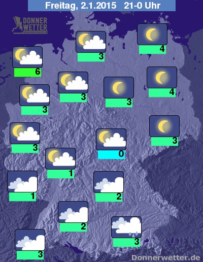 Heute Abend bleibt es in Süddeutschland verbreitet stark oder dicht bewölkt und es kann hier und da auch noch etwas Schnee, Schneeregen oder Regen fallen. Weiter nördlich lockert die Bewölkung dagegen meist auf und vor allem im Osten und Nordosten wird es oft sternenklar, dabei bleibt es trocken. Nur im Nordseeküstenumfeld sind einzelne Schauer möglich. Die Abendtemperatur liegt bei 6 Grad an der Nordsee und um 0 Grad am Thüringer Schiefergebirge. Im Norden weht ein teils stürmischer, im Küstenumfeld ein teils orkanartiger Wind.