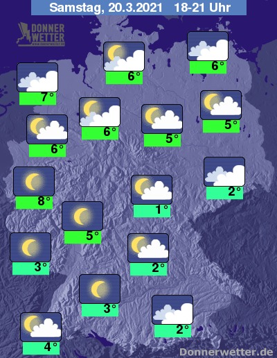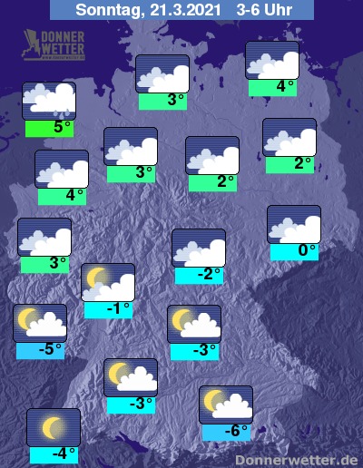 In der Nacht zum Sonntag bleibt es über der Nordhälfte Deutschlands weitgehend bedeckt und im Norden fällt zudem zeitweise leichter Regen oder Sprühregen. Weiter nach Süden hin ist es dagegen locker bis aufgelockert bewölkt und es bleibt trocken. Die Temperatur sinkt auf 5 Grad in Emden und bis -6 Grad in Berchtesgaden.