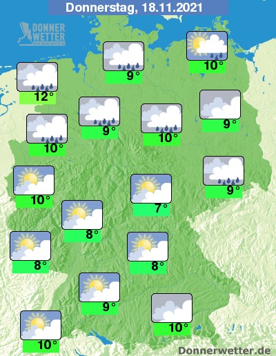 Am Donnerstag bleibt es über dem Norden verbreitet stark bewölkt oder trüb, im Küstenumfeld fällt dabei zeitweise Regen, der bis zum Abend auch den übrigen Norden und teils auch den Osten erreicht. Im übrigen Land ist es teils stark, teils aber auch aufgelockert bewölkt, dabei bleibt es trocken. Die Temperatur steigt auf 7 Grad in Erfurt und bis 12 Grad an der Nordsee. An den Küsten weht weiterhin ein oft stürmischer Wind.