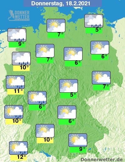 Am Donnerstag ist es zunächst teils stark, teils locker bis aufgelockert bewölkt, dabei bleibt es noch weitgehend trocken. Im Westen und Südwesten ziehen im Tagesverlauf jedoch dichte Wolken auf, die hier Regen mitbringen, im übrigen Land bleibt es weiterhin meist trocken. Die Temperatur steigt auf 5 Grad auf Rügen und bis 12 Grad im Breisgau.