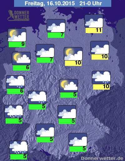 Heute Abend bleibt es im Süden und Westen weitgehend bedeckt und es fällt gebietsweise Regen, im Südwesten mischen sich hier und da auch mal ein paar Flocken in den Regen. Im übrigen Bundesgebiet ist es oft stark, hier und da aber auch aufgelockert bewölkt, dabei bleibt es größtenteils trocken. Die Abendtemperatur liegt bei 11 Grad in Rostock und um 5 Grad im süddeutschen Raum.