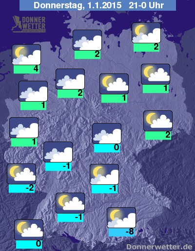 In der Nacht zum Freitag ziehen von Nordwesten her dichte Regenwolken herein, die sich bis zum Morgen etwa bis zu einer Linie von Rheinland-Pfalz nach Berlin-Brandenburg ausbreiten, dabei ist anfangs stellenweise noch mit überfrierender Nässe zu rechnen, da der Boden nicht selten noch gefroren ist. Weiter nach Südosten bleibt es dagegen bei oft aufgelockerter Bewölkung noch trocken. Die Tiefstwerte liegen bei 4 Grad an der nördlichen Ems und bei -5 Grad in München.