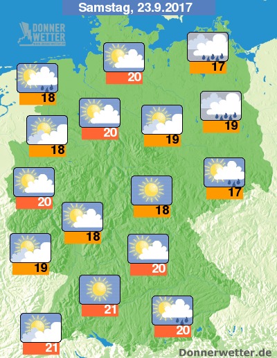 Am Samstag drückt ein Tiefausläufer von Osten her nach Sachsen und Berlin-Brandenburg herein und bringt bei dichten Wolken auch zeitweise Regen. Vereinzelte Schauer sind am Alpenrand sowie über dem Emsland möglich, sonst herrscht jedoch verbreitet heiteres, teils sonniges und dabei trockenes Wetter. Die Temperatur erreicht 17 Grad in Stralsund und bis 21 Grad im Oberrheingraben.