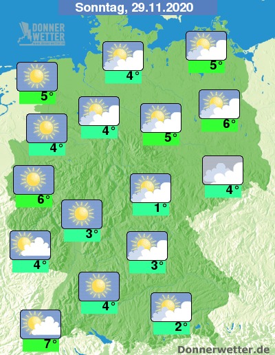 Am Sonntag zeigt sich das Wetter zum Teil stark bewölkt oder trüb, gebietsweise wird es aber auch sonnig, dabei bleibt es trocken. Die Temperatur erreicht rund 1 Grad in Erfurt und bis 7 Grad in Freiburg.